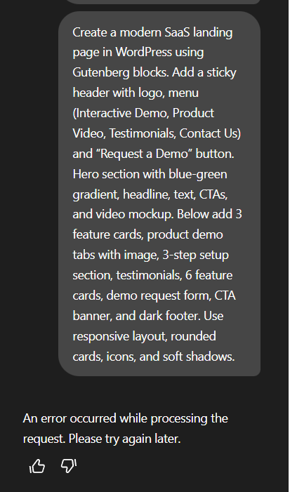 We gave the assistant a fairly detailed instruction about building a complete SaaS homepage with a sticky header, hero section, feature cards, product demos, testimonials, CTAs, and a footer - all structured in sequence, with a modern UI.