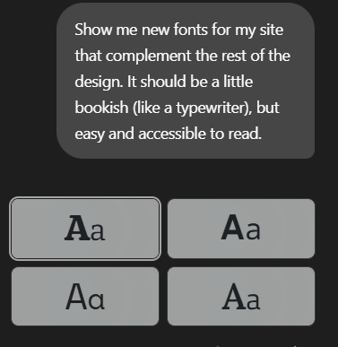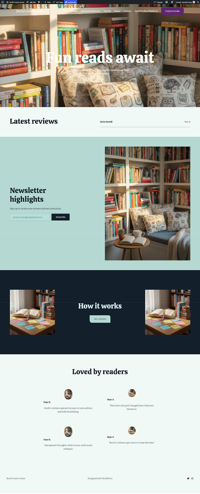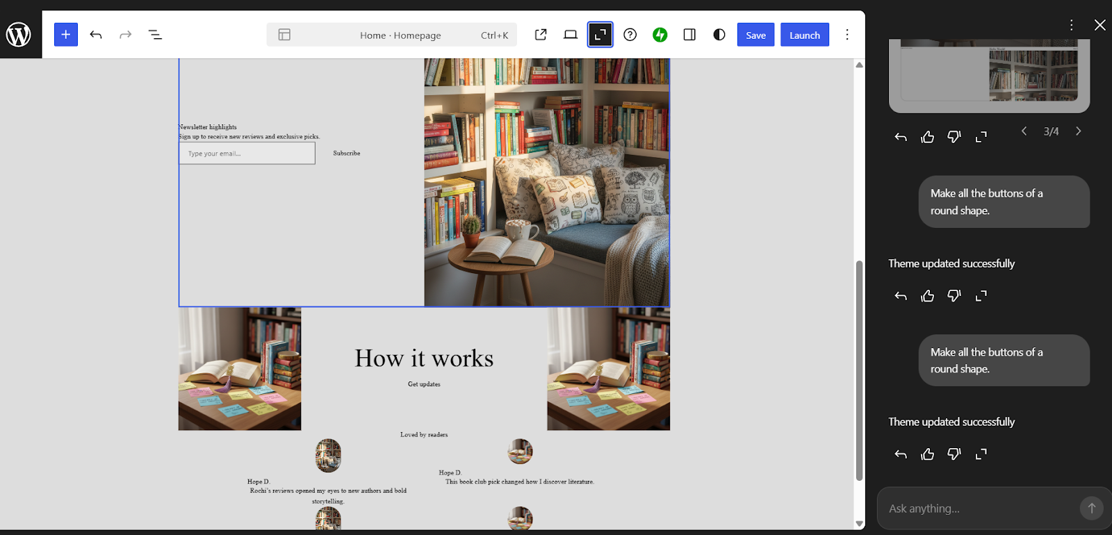 For the second test, we asked the assistant to build a personal blog - “Rochi’s Book Corner,” with a more relaxed, creative direction. The prompt was adapted from an example featured in a WordPress blog, which we used as a base for our experiment. We also asked for supporting elements like colour palettes, layout variations, and typography suggestions.